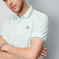 Smarten your casual wardrobe with this T-shirt rendered in a solid tone. It features a polo collar, short sleeves, contrast striped trim, and side slits at the hem.